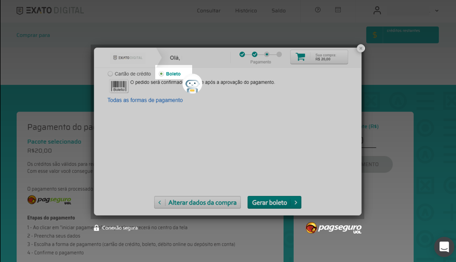 Caso o problema persista, você pode escolher outra forma de pagamento selecionando a opção "Boleto", conforme imagem abaixo: